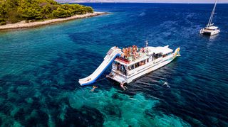 Then we set sail to the most famous attraction – Blue Lagoon, where you can enter the turquoise on a special way with our 2-meter-long water slide, you will not regret it! Enjoy the sea depths of one of the most famous bays in Split with us!