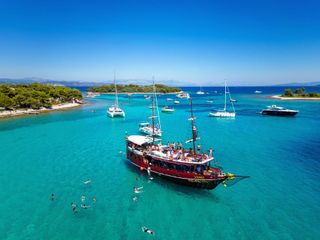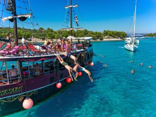 Meet your guide in the middle of the Riva promenade in Split. Climb aboard the pirate ship and get settled before setting sail. First, stop at Fumija Bay. Borrow a snorkel and mask and jump into the water. Spend an hour swimming around.